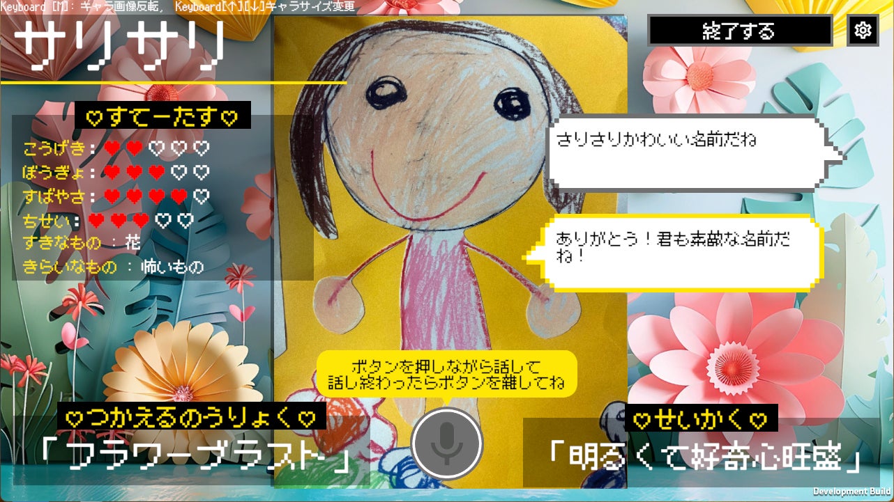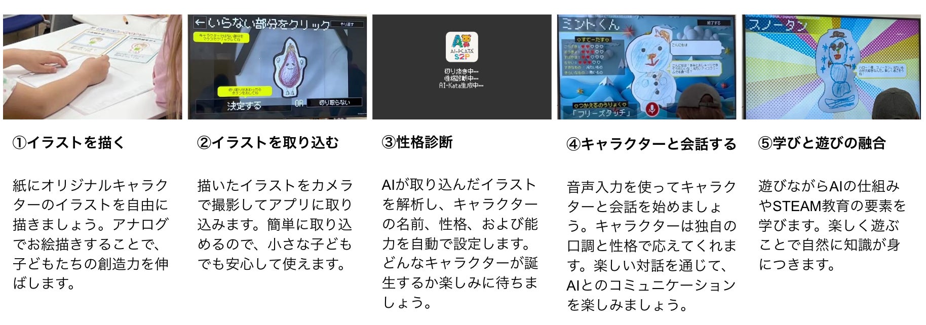 幼少期のお子様を対象に、創造力や問題解決能力を育むことを目的とした教育ツールです。ユーザーが描いた絵をパソコンに取り込み、キャラクターを生成します。そして、AIがそのキャラクターに名前と性格を与え、ユーザーとの会話を可能にします。